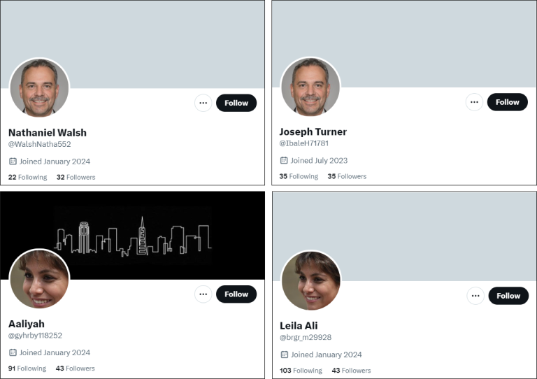Many of the accounts operating on Facebook and X appeared to use AI-generated photos which had the hallmarks of generative adversarial networks (GAN). The DFRLab counted a total of eighteen profile photos on Facebook and more than fifty others on X utilizing images that were likely GAN-generated.