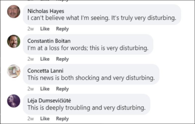 Other accounts posted similar comments and replies, such as four different accounts responding to the same Facebook post all claiming to express shock, all signing off with variants of “very disturbing.”
