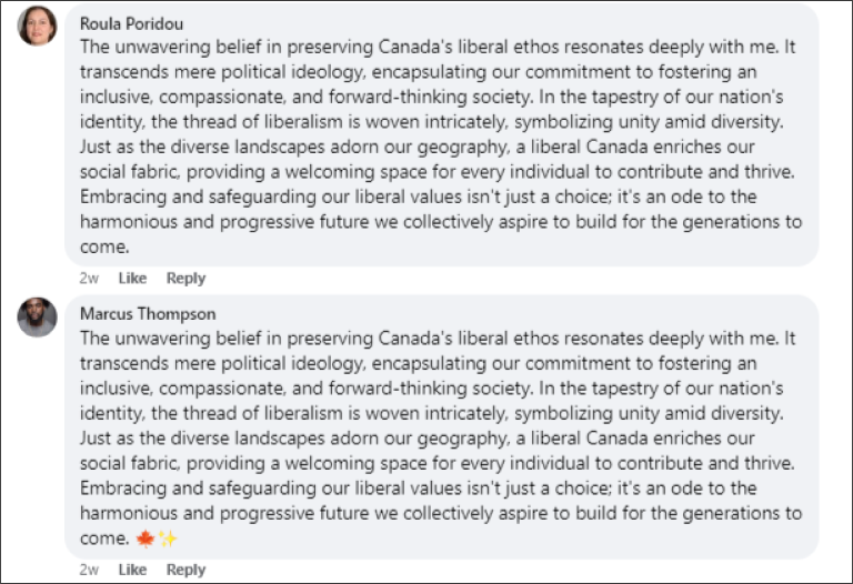 In another instance, two Facebook accounts replied to a UCC post within fifteen minutes of each other, this time using much longer overlapping text about “preserving Canada’s liberal ethos,” with one comment adding two emojis at the end of the text.