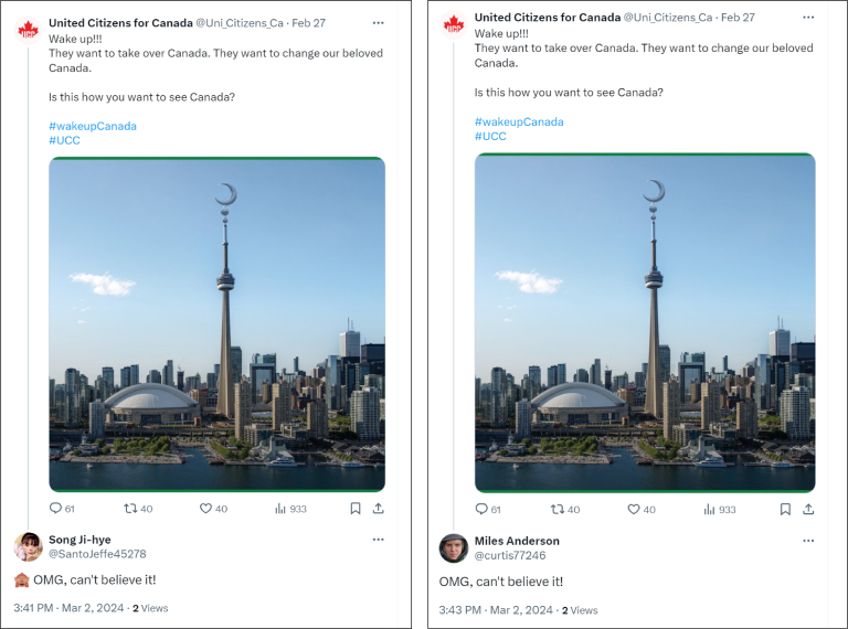 “Inauthentic campaign amplifying Islamophobic content targeting Canadians,” Digital Forensic Research Lab (DFRLab), March 28, 2024, https://dfrlab.org/2024/03/28/inauthentic-campaign-amplifying-islamophobic-content-targeting-canadians.