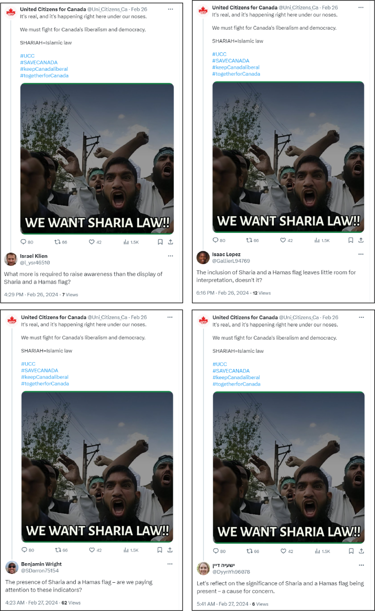 United Citizens of Canada described itself as a “vigilant” non-profit organization created by Canadian citizens worried about the “possible future Canada is heading.” Prior to being deplatformed by Meta, the page stated that it aimed to identify and address “the increasing presence and support for anti-liberal, aggressive, and violent Islamic movements and organizations in Canada,” which according to the group is increasing because of Canada’s liberal immigration policy. UCC promoted such views through its X account and now-defunct Facebook page, both created on February 18, 2024, as well as its YouTube account and now-removed Instagram page. It also maintains a website that was registered on February 26, 2024. UCC’s Instagram account was first created in August 2019, but was likely repurposed from its original use, as it previously had five other usernames at various points of time.